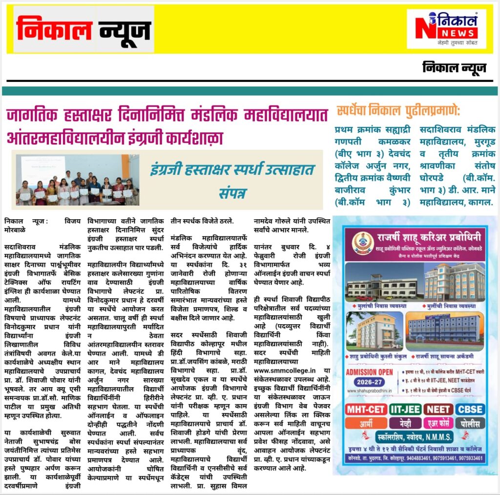 Are you proud of your penmanship? Showcase your Handwriting skills and compete with the best! The Department of English of Sadashivrao Mandlik Mahavidyalaya, Murgud, invites all undergraduate students to participate in the upcoming Intercollege English Handwriting Competition to celebrate World Handwriting Day on 23rd January. We request fraternity of faculty members of all College under the purview of Shivaji University, Kolhapur to inspire your students to visit our college premises for an experience of participating in a competition in a college other than theirs. We hope you will kindly support us by sending at least THREE interested students for this venture.