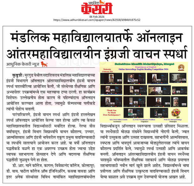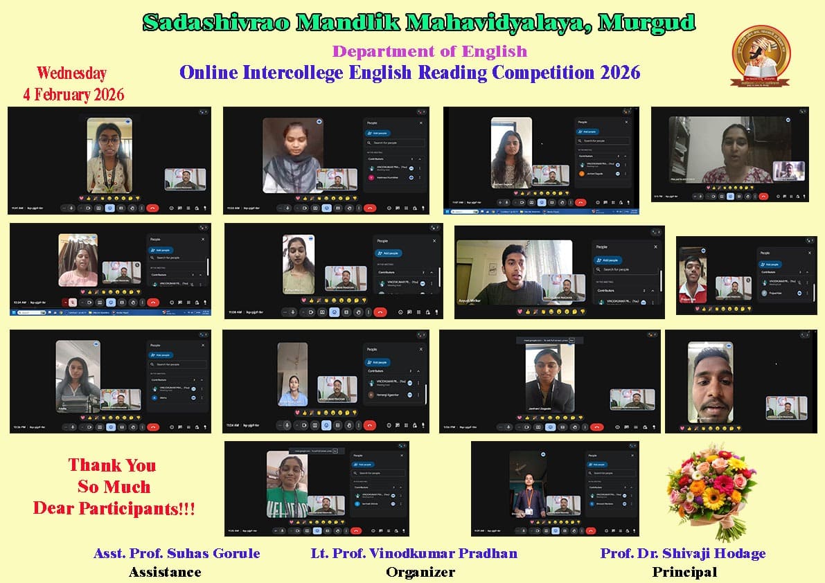 The Department of English of Sadashivrao Mandlik Mahavidyalaya, Murgud successfully organized an Online Intercollege English Reading Competition, marking a significant milestone in the academic and extracurricular activities of the institution. This event was particularly noteworthy as it was conducted online for the first time, expanding its reach beyond the campus.