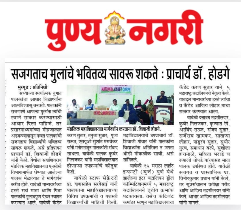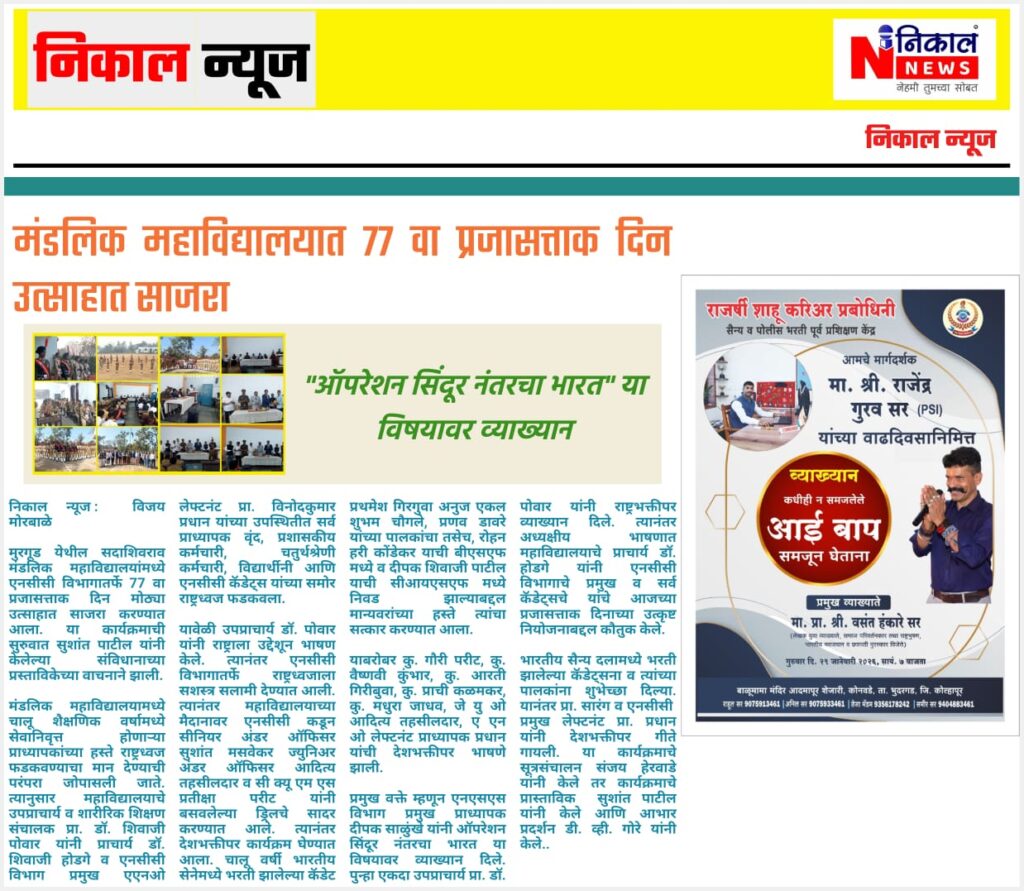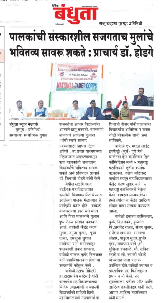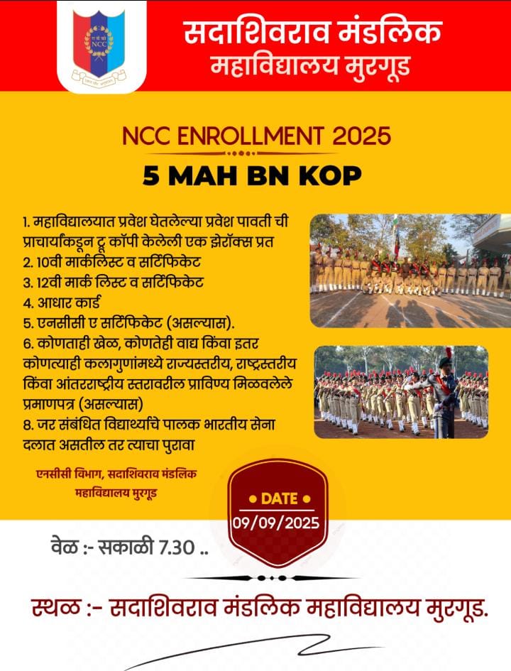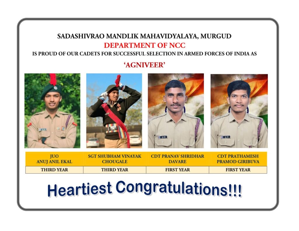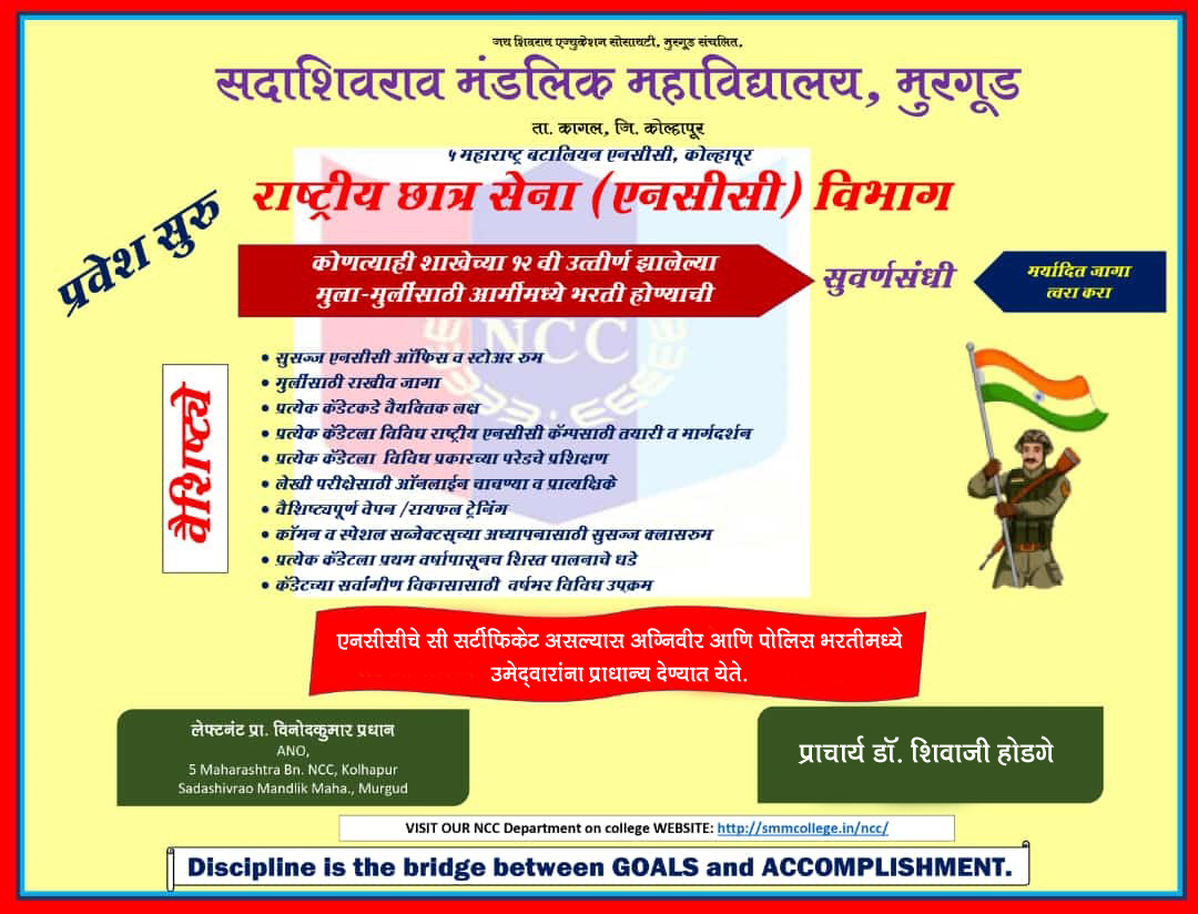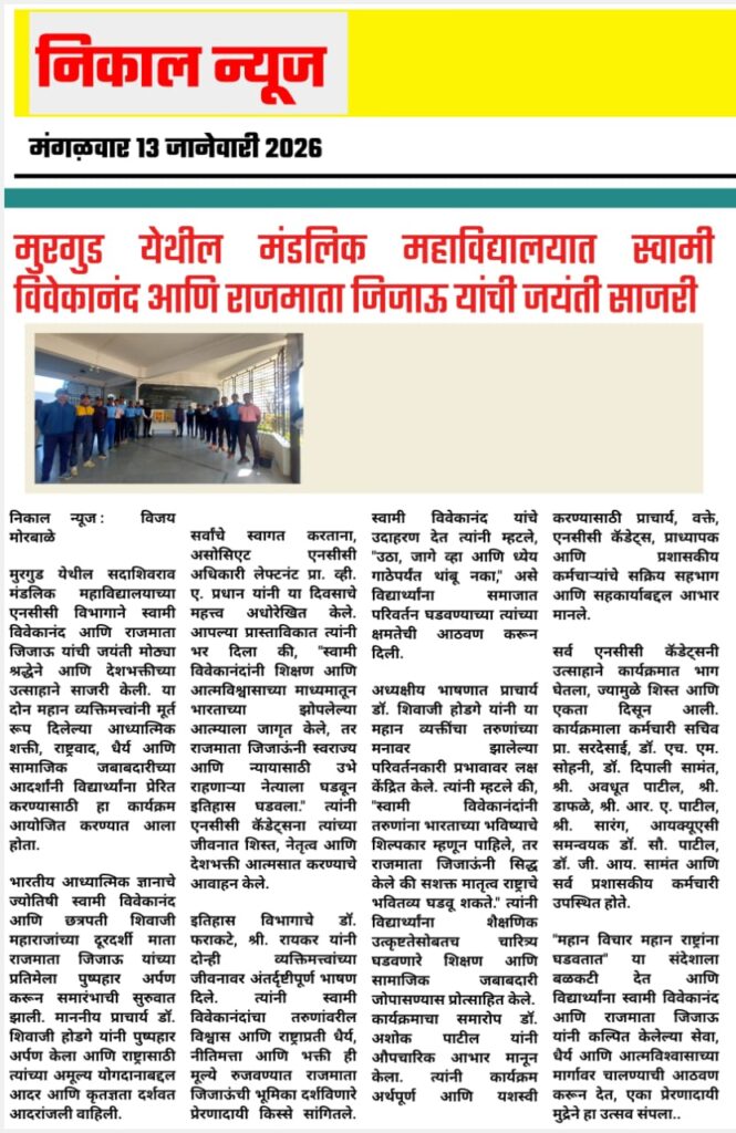 The Department of NCC of Sadashivrao Mandlik Mahavidyalaya, Murgud, organized a programme to celebrate the birth anniversaries of Swami Vivekanand and Rajmata Jijau with great respect and enthusiasm. The objective of the programme was to acquaint students with the inspirational lives, thoughts, and contributions of these great personalities and to inculcate values of patriotism, leadership, and moral strength among the youth.
