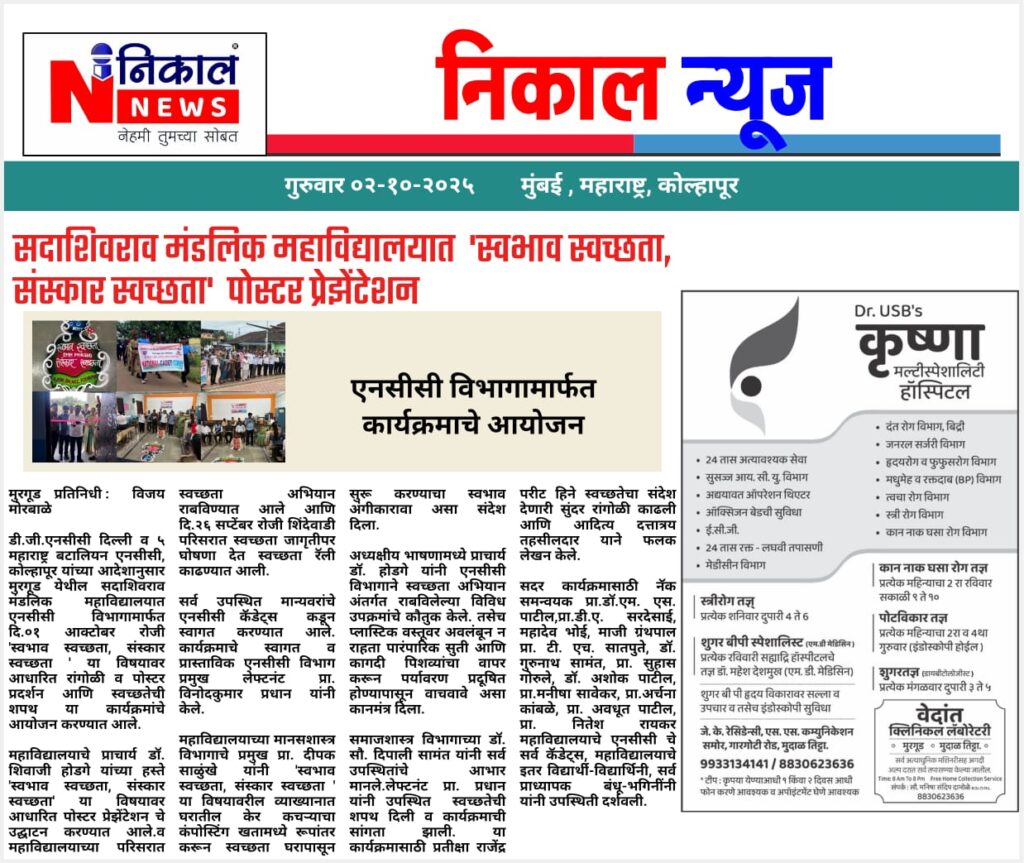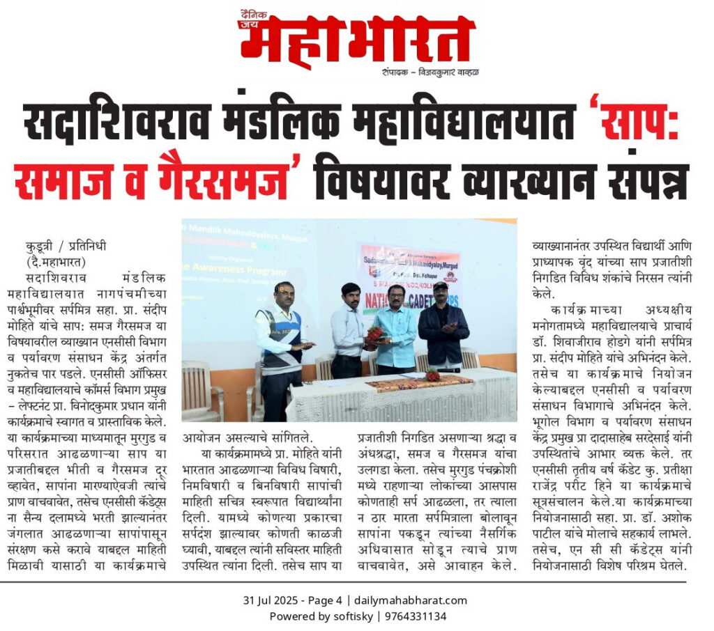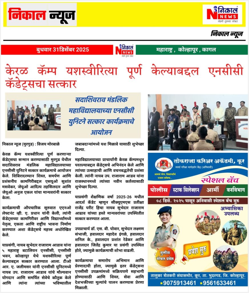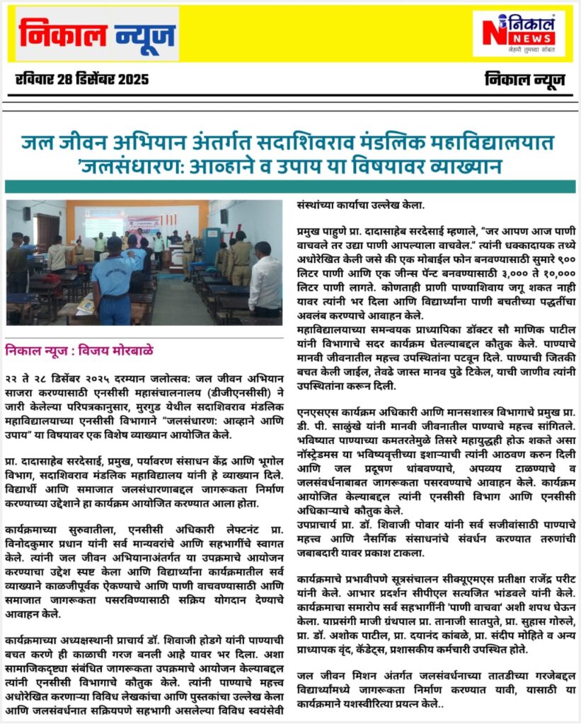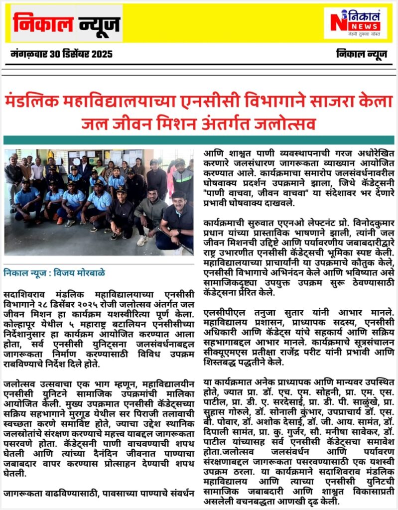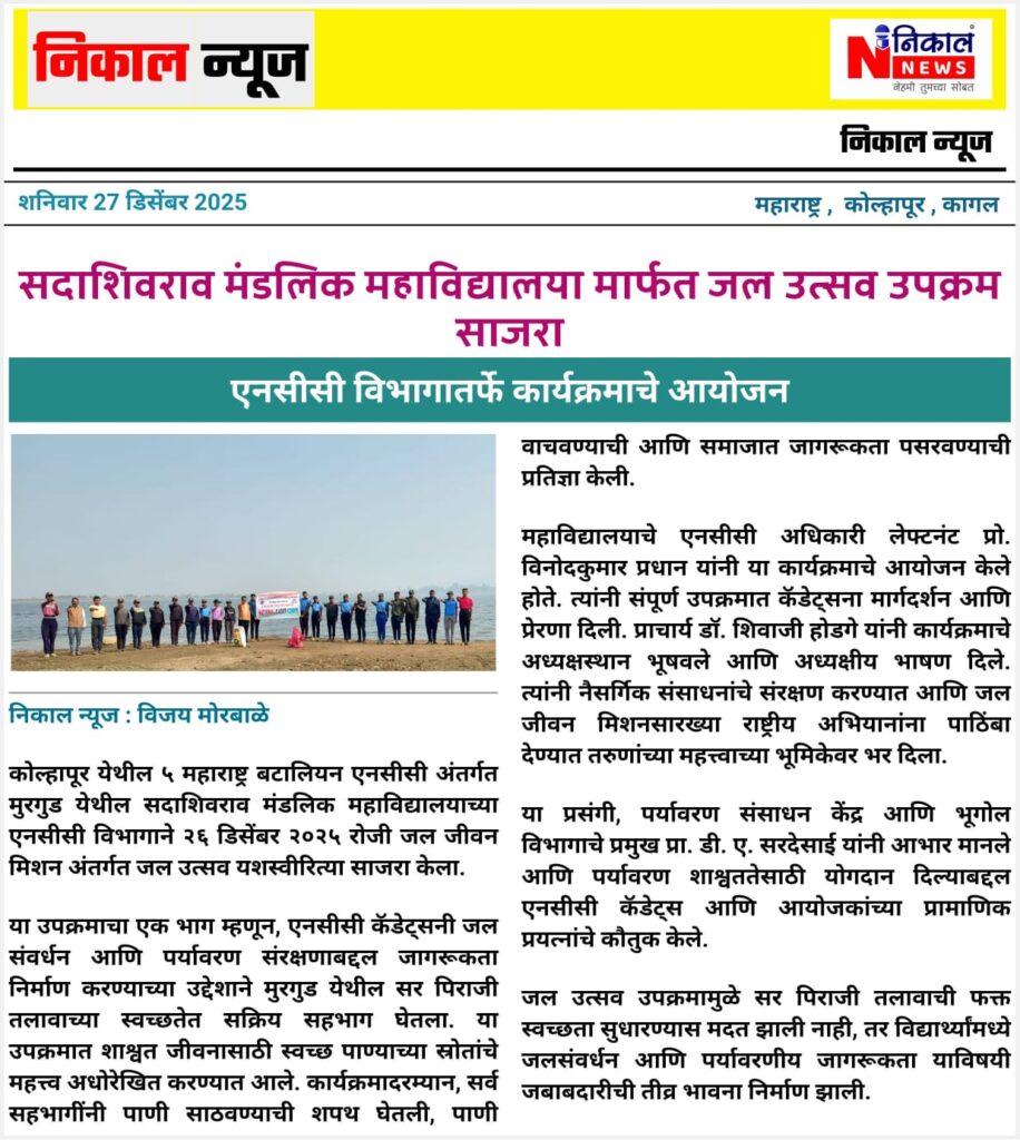 The Department of NCC of Sadashivrao Mandlik Mahavidyalaya, Murgud, under 5 Maharashtra Battalion NCC, Kolhapur, successfully celebrated Jal Utsav SSCD Activity under the Jal Jeevan Mission from 22 to 28 December 2025.