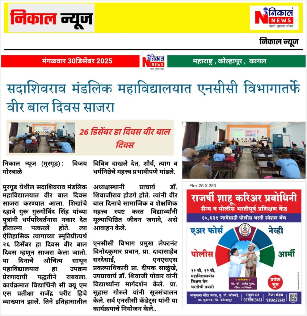 The entire event was successfully planned and executed by the NCC cadets of the college. The celebration concluded with a renewed sense of patriotism and commitment among students to uphold the values of courage, sacrifice, and service to society inspired by the martyrdom of the Veer Bal.