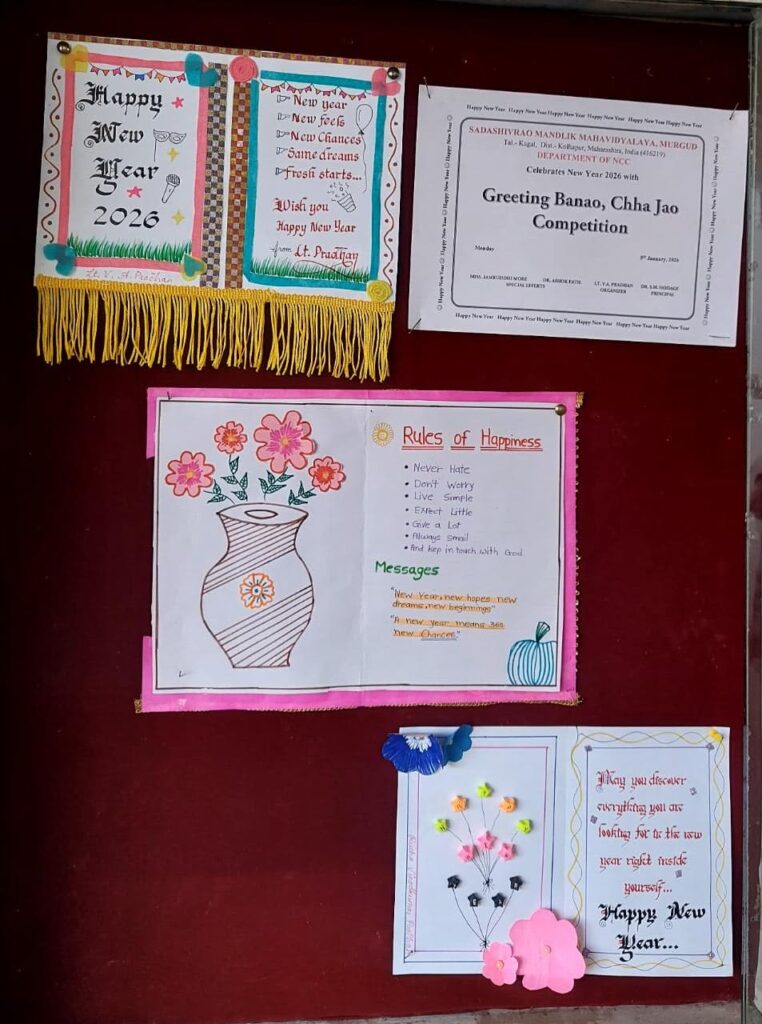 The greeting cards prepared by the students were later displayed on the college notice board. The exhibition was inaugurated by Principal Dr. S. M. Hodage on January 5, 2026. Dr. Ashok Patil welcomed the gathering, while ANO Lt. Vinodkumar Ashok Pradhan explained the objectives and expected outcomes of the programme. In his address, the Principal commended the NCC Department for organising a meaningful, creative, and eco-friendly activity and encouraged students to actively participate in similar programmes in the coming years.