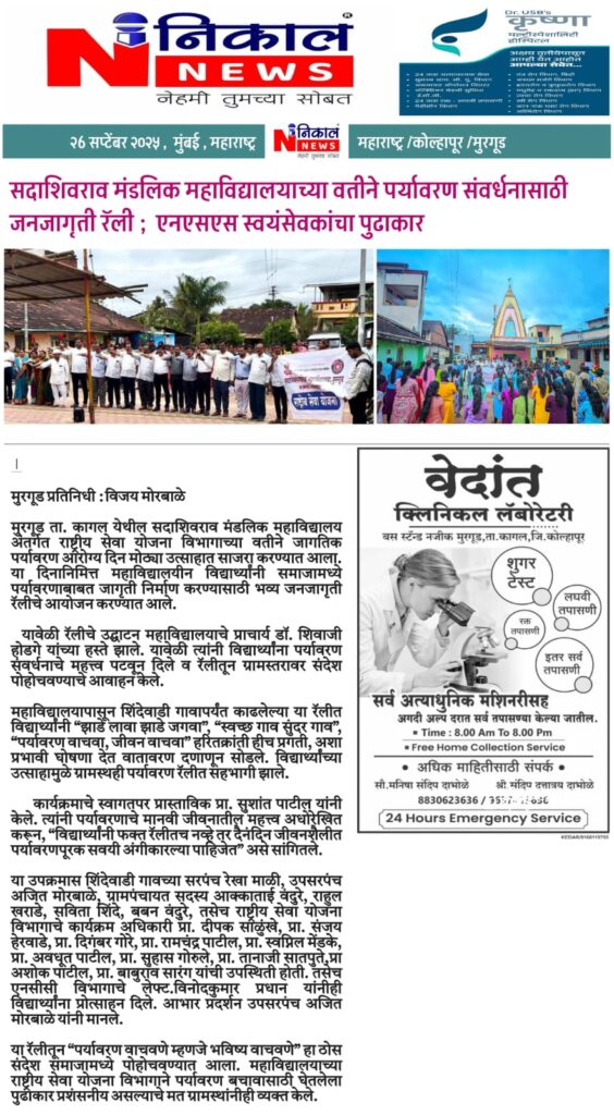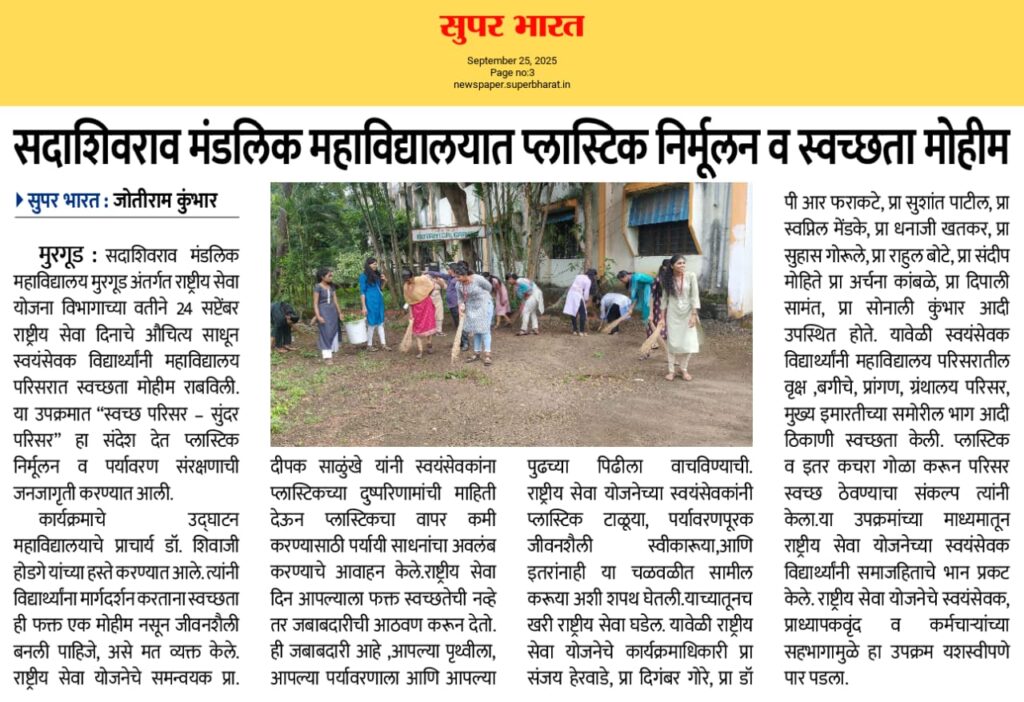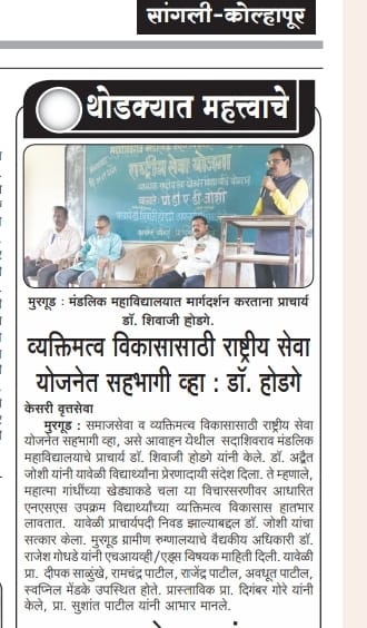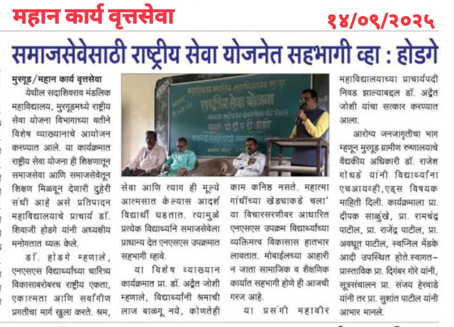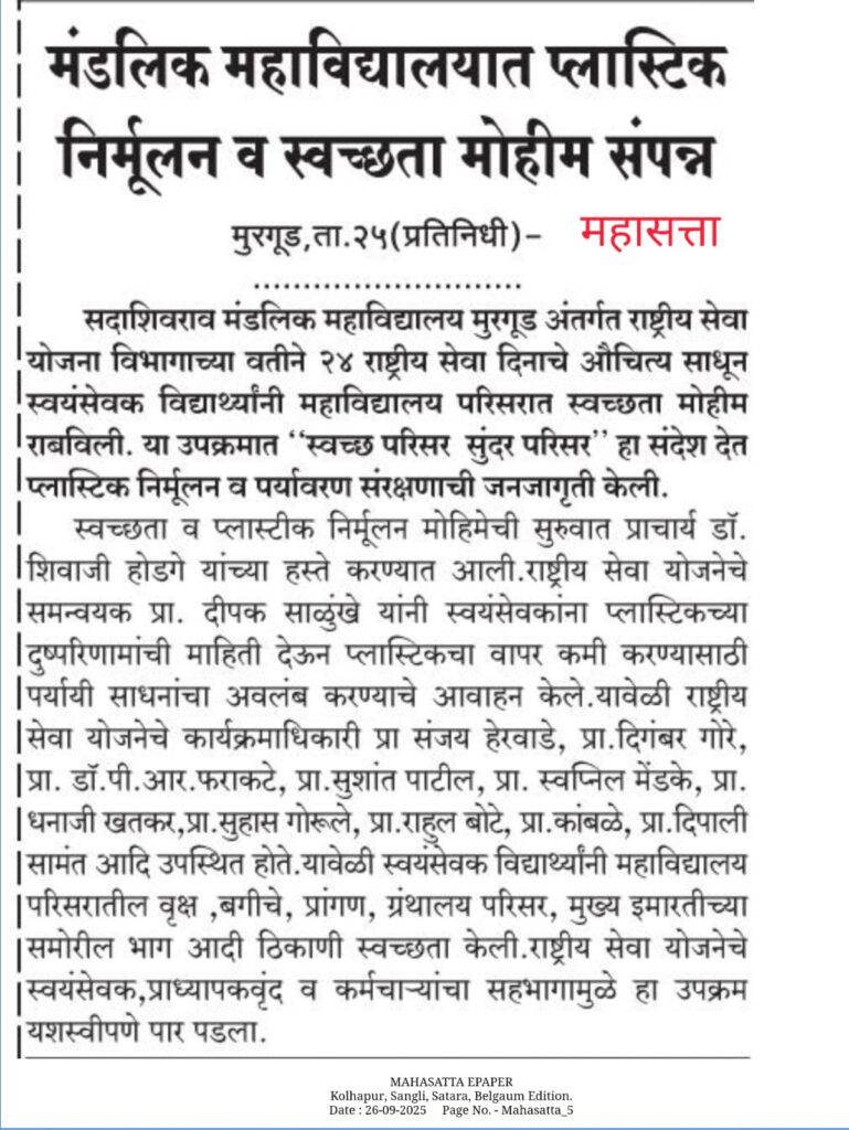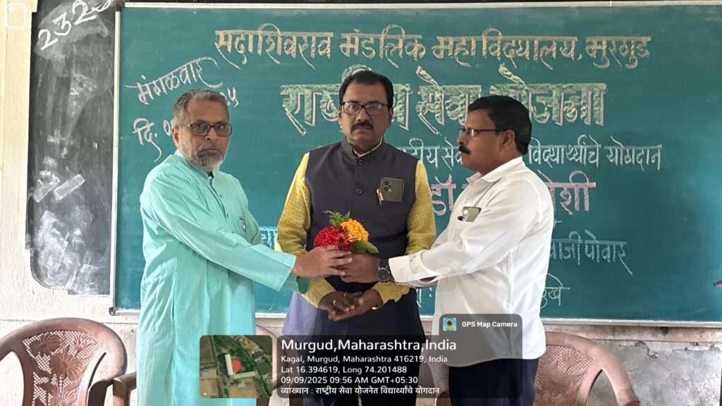 मुरगूड : सदाशिवराव मंडलिक महाविद्यालय मुरगुड अंतर्गत राष्ट्रीय सेवा योजना विभागाच्या वतीने 24 सप्टेंबर राष्ट्रीय सेवा दिनाच्या निमित्ताने राष्ट्रीय सेवा योजना सप्ताहाचे उद्घाटन महाविद्यालयाचे प्राचार्य डॉ शिवाजी होडगे यांच्या हस्ते करण्यात आले. “शिक्षण हेच खऱ्या अर्थाने समाजपरिवर्तनाचे प्रभावी माध्यम आहे. शिक्षक हे विद्यार्थ्यांच्या आयुष्यातील दीपस्तंभ आहेत,” असे प्रतिपादन त्यांनी यावेळी केले.