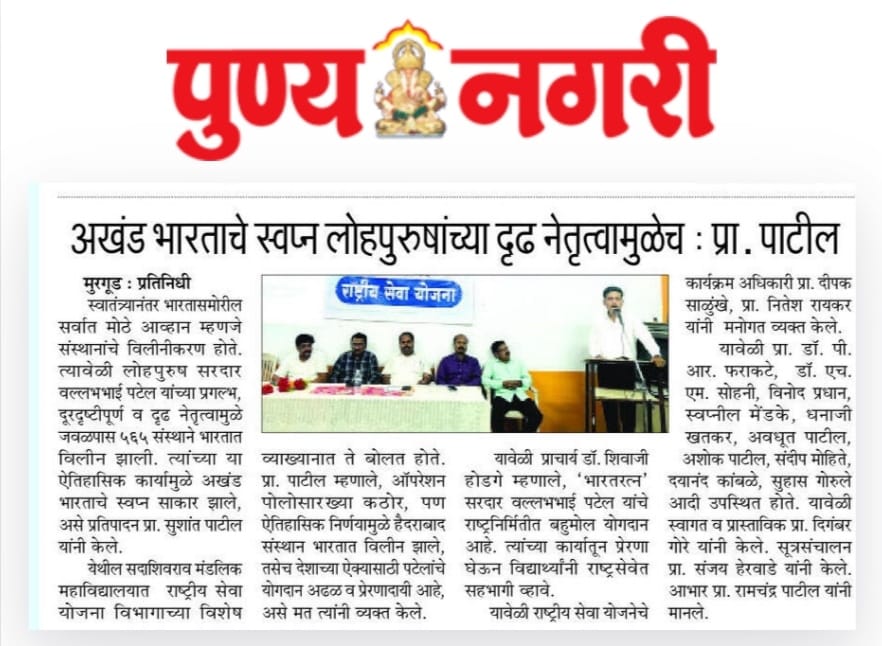 प्रा.पाटील पुढे म्हणाले की “ऑपरेशन पोलो” सारख्या कठोर पण ऐतिहासिक निर्णयामुळे हैदराबाद संस्थान भारतात विलीन झाले, तसेच देशाच्या ऐक्यासाठी पटेलांचे योगदान अढळ व प्रेरणादायी आहे,” असे मत त्यांनी व्यक्त केले. यावेळी स्वागतपर प्रास्ताविक प्रा.दिगंबर गोरे यांनी केले.