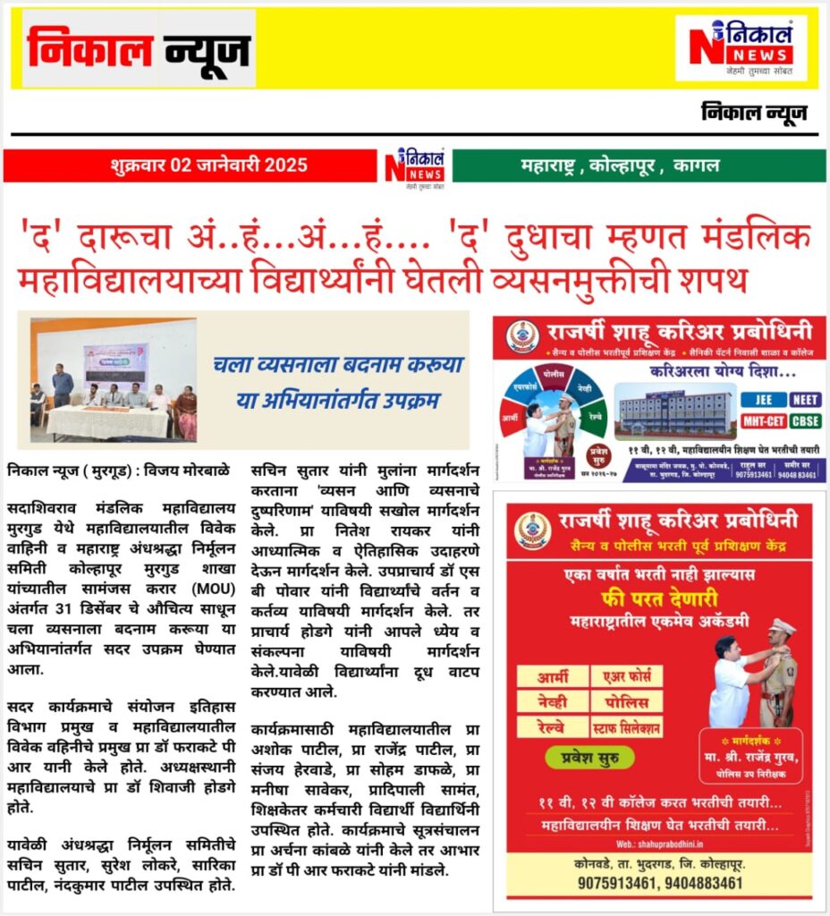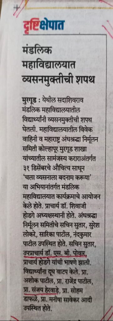 विद्यार्थ्यांनी वैज्ञानिक दृष्टिकोन आत्मसात करणे गरजेचे : स्मिता सुधीर ; मंडलिक महाविद्यालयात चमत्कारा मागील विज्ञान कार्यक्रमाचे आयोजन