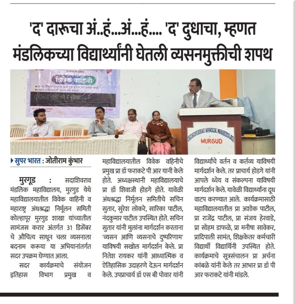 सदाशिवराव मंडलिक महाविद्यालय, मुरगूड येथे डॉक्टर नरेंद्र दाभोळकर यांची पुण्यतिथी विवेक वाहिनी तर्फे आयोजित करण्यात आली. यावेळी डॉक्टर दाभोळकरांच्या प्रतिमेला डॉक्टर राजेंद्र कुमार यांनी पुष्पहार घालून अभिवादन केले. या पुण्यतिथी निमित्त कार्यक्रमाचे प्रमुख पाहुणे ज्येष्ठ विचारवंत, अभ्यासक, अंधश्रद्धा निर्मूलनाचे अध्यक्ष, माजी प्राचार्य डॉ. राजेंद्र कुंभार हे होते. यावेळी ते म्हणाले की, देव व धर्माचा वापर सामान्य लोकांना फसविण्यासाठी तसेच पैसा मिळविण्यासाठी केला जातो. समाजाने व्यवस्थेलासुध्दा प्रश्न विचारले पाहिजेत .उत्तरे सुद्धा शोधली पाहिजेत. यावेळी कार्यक्रमाचे अध्यक्ष प्राचार्य डॉ. अर्जुन कुंभार सर म्हणाले की, अभ्यासक्रमाच्या पलीकडे जाऊन मोठेमोठया विचारवंताचे एक व्याख्यान आयुष्य बदलून टाकते. यावेळी इतिहास विभागाकडून प्रा. डॉ. फराकटे यानी पाहुण्यांचे स्वागत व कार्यक्रमाची प्रस्तावना केली. यावेळी विचार मंचावर प्रा. डॉ. होडगे, प्रा. डॉ. शिवाजी पोवार तसेच उपस्थितीमध्ये प्रा. डॉ. उदयकुमार शिंदे, प्रा. डॉ. एस. के पवार, प्रा. सरदेसाई, प्रा. सारंग, प्रा. विनोद प्रधान, प्रा. सौ. कुंभार तसेच बी.ए., बी. कॉम., बी.एससी., बी.सी.ए या विभागातील विद्यार्थी विद्यार्थीनी, कर्मचारी वर्ग उपस्थित होते. या कार्यक्रमाचे सूत्रसंचालन प्रा. सौ. ए.के कांबळे यांनी केले तर आभार प्रदर्शन प्रा. पी. पी. कुचेकर यांनी व्यक्त केले.